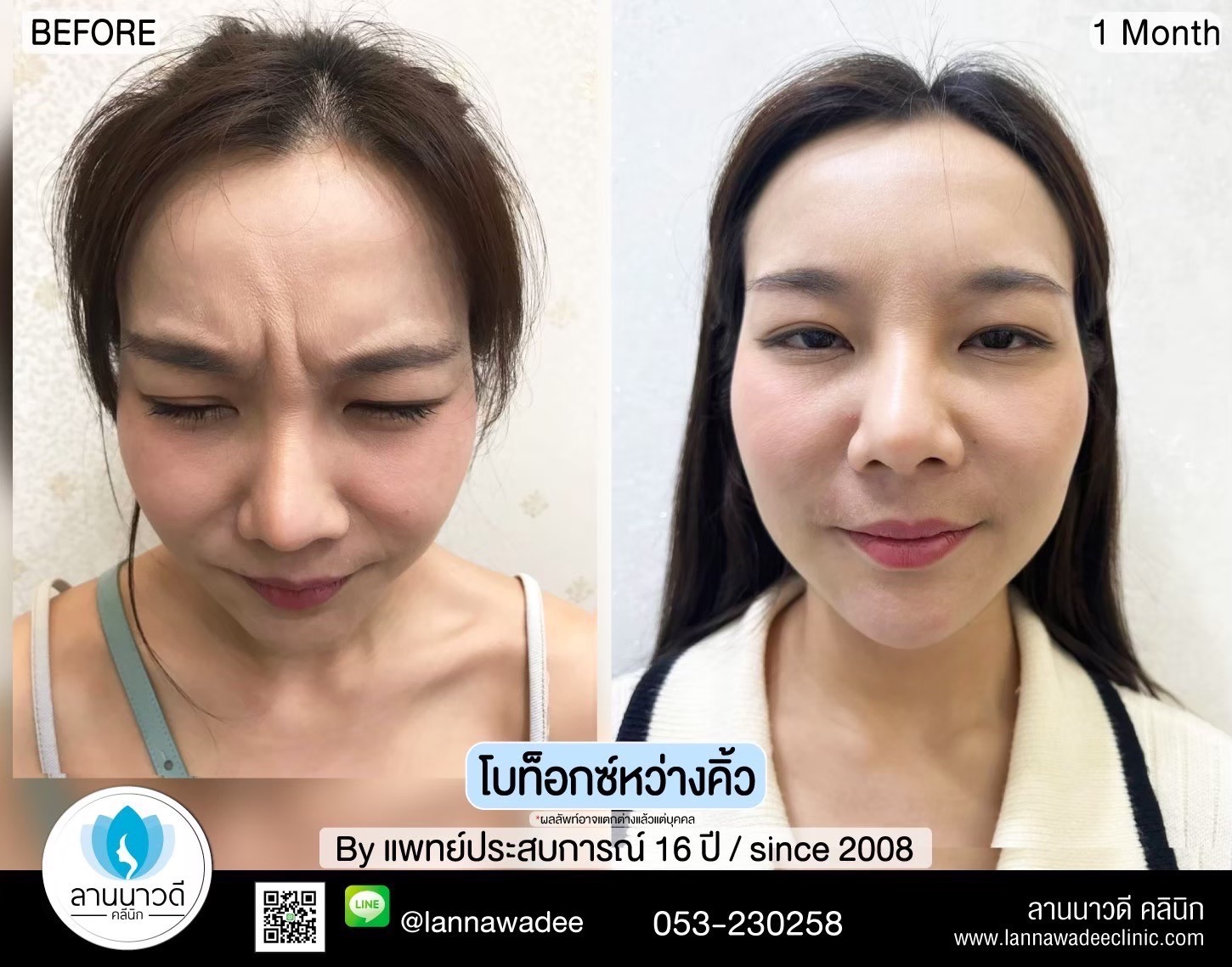 2. ลดริ้วรอยหว่างคิ้ว เกิดจากการทำงานของกล้ามเนื้อบริเวณหว่างคิ้วที่มากจนเกินไปเวลาขมวดคิ้วทำให้เกิดเป็นก้อน และร่องลึกได้ การฉีดโบท็อกบริเวณนี้จะช่วยคลายกล้ามเนื้อทำให้ไม่เป็นก้อน และร่องลึกเกิดขึ้น