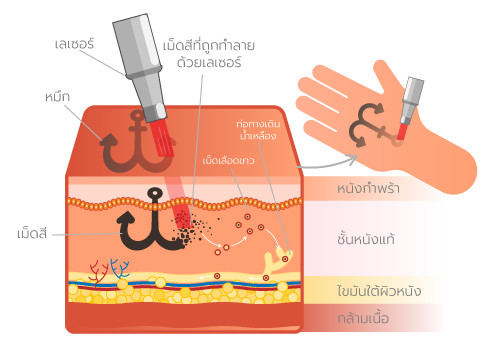 • เลเซอร์จะปล่อยพลังงานแสงที่มีความยาวคลื่นเฉพาะ ทำให้เม็ดสีหมึกแตกตัวเป็นอนุภาคเล็ก ๆ• จากนั้นร่างกายจะกำจัดเศษเม็ดสีเหล่านี้ตามกระบวนการทางธรรมชาติของระบบภูมิคุ้มกัน• ต้องทำซ้ำหลายครั้ง เนื่องจากหมึกฝังอยู่หลายชั้นในผิว